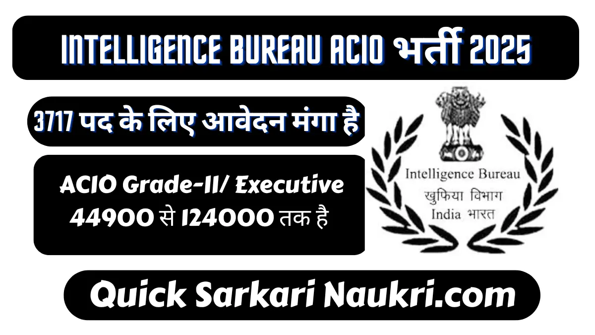 IB ACIO Recruitment 2025 – होम मिनिस्ट्री ऑफ इंडिया ने IB ACIO भर्ती 2025 के लिए आवेदन मंगा है अगर आप होम मिनिस्ट्री में काम करना चाहते है तो आप इस के लिए आवेदन कर सकते हैं ये सरकारी नौकरी के लिए बेहतरीन मौका हो सकता है ये मौका आपको डायरेक्ट होम मिनिस्ट्री ऑफ इंडिया के लिए वर्क करना रहेगा ib ने ये Assistant Central Intelligence Officer (ACIO) Grade-II ke लिए आवेदन मंगा है इस पद के आवेदन दिनांक 19 जुलाई 2025 से शुरू हो चुका है और अंतिम तिथि 10 अगस्त 2025 है जो भी I B भर्ती 2025 के लिए आवेदन करना चाहते है कर सकते है