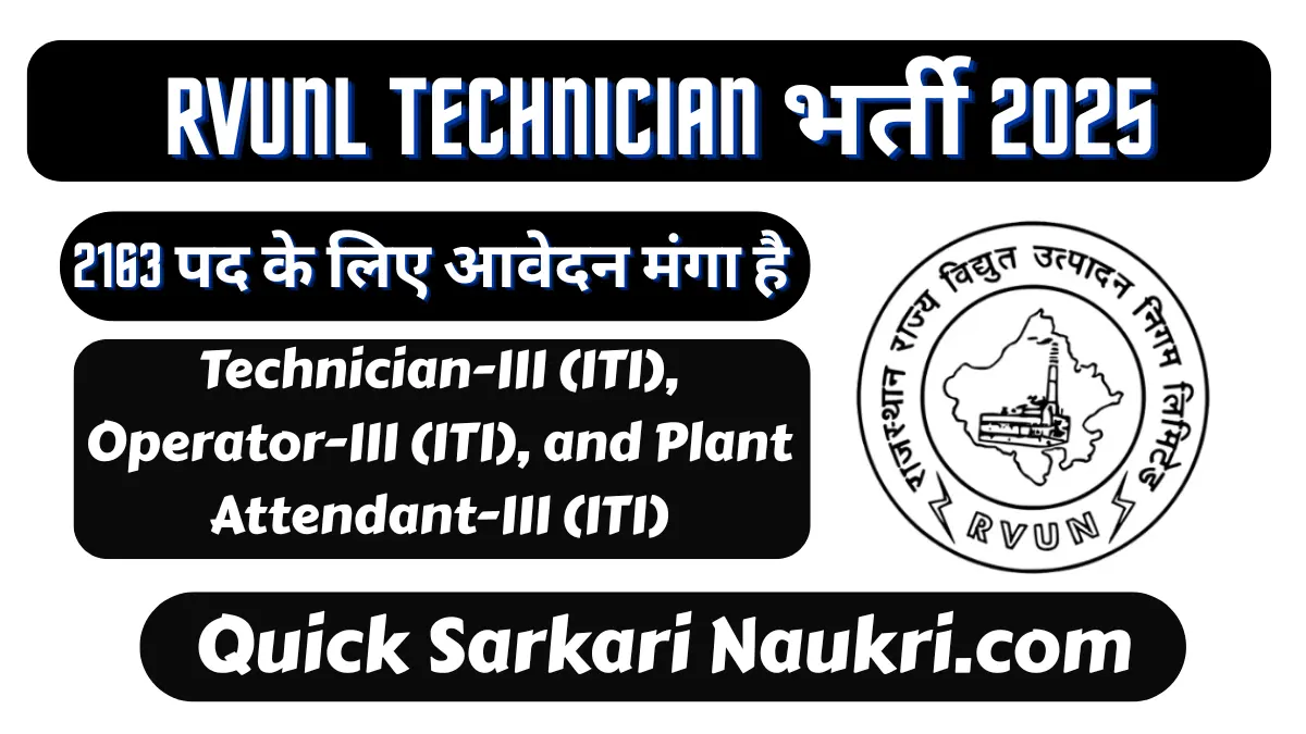 RVUNL Technician Recruitment 2025 [2163 Post] नोटिफिकेशन जारी आज ही करे अपलाई The Rajasthan Vidyut Utpatdan Nigam Limited (RVUNL) राजस्थान विद्युत उत्पन निगम लिमिटेड के 2163 पद के लिए आवेदन मंगा है अगर आप किसी सरकारी नौकरी की तलाश में है तो ये मौका आप के लिए आवेदन कर सकते है राजस्थान विद्युत उत्पन निगम लिमिटेड नोटिफिकेशन के मुताबिक़ लगभग 2163 अलग अलग पदों के लिए जिसमें Technician-III (ITI), Operator-III (ITI), and Plant Attendant-III (ITI) ये सारे पद है अगर आप अपलाई करने लिए चाहते है तो कर सकते है राजस्थान विद्युत उत्पन निगम ने Advertisement Number RVUNL/ Rectt.-2024/04. Now, on July 17, 2025, ke माध्यम से आवेदन मंगा है अपलाई करने से पहले ऑफिसियल नोटिफिकेशन एक बार ध्यान से पढ़ ले ऑफिसियल नोटिफिकेशन नीचे importan लिंक के बॉक्स में दिया गया है अपलाई करे कि दिनांक अगस्त २०२५ से चालू है है ऑफिसियल वेबसाइट की लिंक से आपको कर सकते है